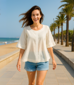 Ma luźny krój, lekko rozszerzane rękawy i delikatną ozdobę wzdłuż przodu – wystarczy prosty materiał, by wyglądać zachwycająco bez wysiłku. Idealna do letnich szortów, lnianych spodni albo ulubionej spódnicy.